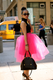 Channel SJP with a muted crop turtle neck and wow factor colour pop skirt.© 2012 All rights reserved.
